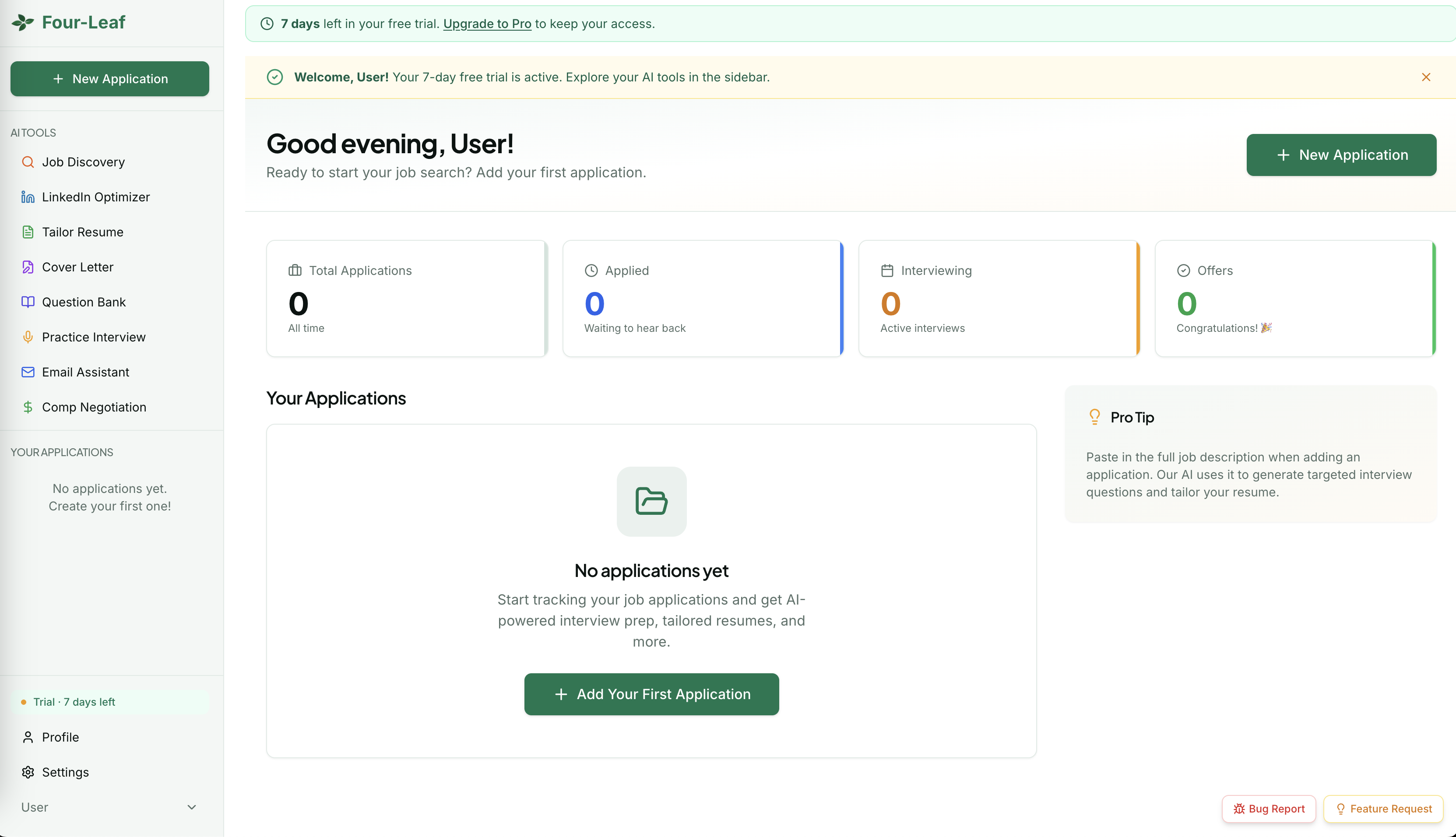 Most tools help one piece of the job search. Four-Leaf covers the whole journey, from tailoring applications and practicing interviews to negotiating your final offer, all in one place.